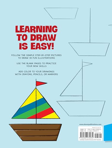Everyone can learn to draw with easy art instruction guide How to Draw Step-by-Step Drawings! Suitable for girls and boys ages 5 to 10, from kindergarten to fifth grade, kids can start with simple diagrams of simple shapes in the beginning and move towards learning to combine shapes to create fun familiar objects and animals. Learn to draw different things by using circles, ovals, rectangles, squares, and other shapes. 64 pages include 30 pictures plus a practice page opposite each drawing. Each picture will help budding artists understand the basics of shape, form, and dimension. Learn to draw an apple, peach, pear, pineapple, tricycle, sailboat, house, cat, rabbit, fish, turtle, and more. These simple directions and step-by-step illustrations make this beginner's guide to drawing easy and fun. Use crayons or colored pencils to color your drawings when finished. Learn to draw in Dover's bestselling series How to Draw featuring 25 titles with simple instructions showing how to draw anything, from animals to holidays, nature, people, seasons, and transportation.